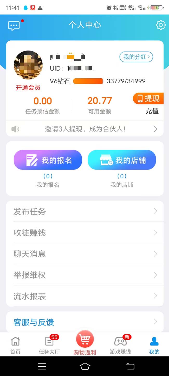 邀请好友做任务赚提成,好友完成任务可获得12%任务奖励+20元新人奖励。每月还有排行榜,最多可获得12888元奖励。
